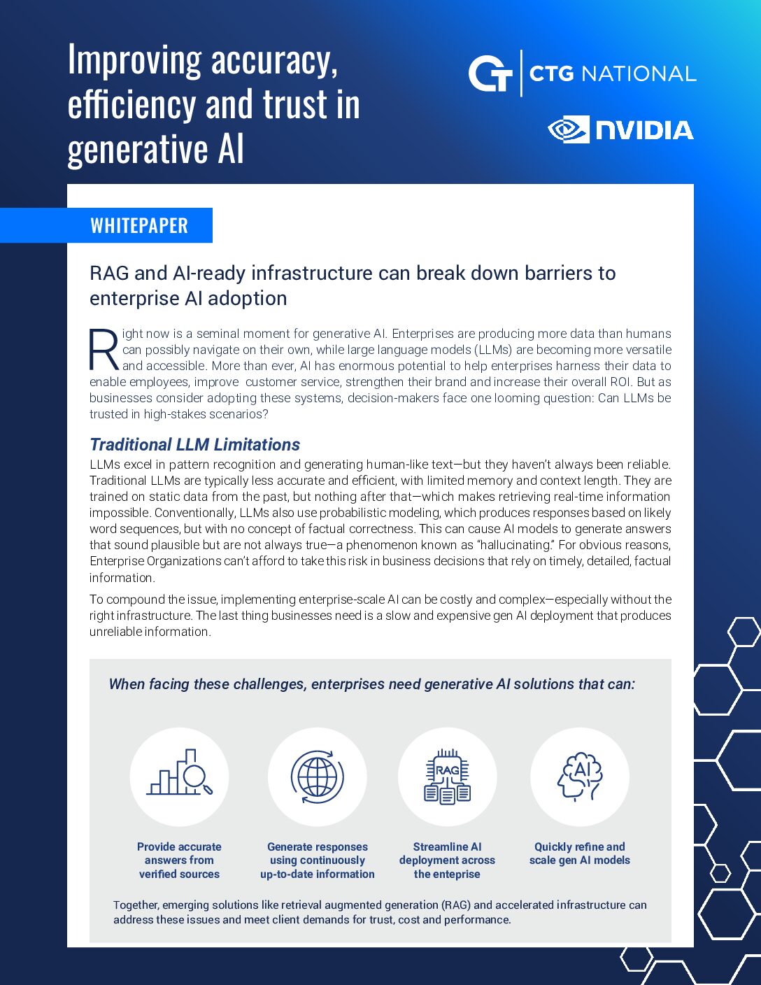 Enterprises trust NVIDIA as a global leader in accelerated computing—with a state-of-the-art infrastructure that powers AI workloads at scale. They also know CTG National’s proven track record as a trusted technology advisor to Enterprise Organizations. Now, as an Authorized NVIDIA DGX Solution Provider, CTG National can help organizations harness NVIDIA to speed AI deployments, optimize workloads and derive new data insights. Together, our solutions can empower businesses to drive innovation and efficiency in nearly every segment of their operations.